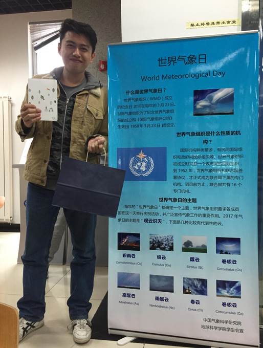 2017年3月23日,我们又迎来了一年一度的气象人的节日-----世界气象日,来自中国气象科学研究院的一年级硕士研究生们参加了国科大地球科学学院在雁栖湖校区举办的气象日有奖问答活动,并作为气象学专业的学生负责了此次活动的题目编辑和气象知识普及。